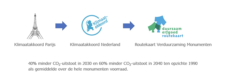 Het verduurzamen van de monumenten staat centraal, maar zeker zo belangrijk is het behoud van de monumentale waarden en het in gebruik houden van monumenten. De Routekaart Duurzaam Erfgoed is een van de twaalf Routekaarten voor maatschappelijk vastgoed. Al die Routekaarten samen moeten leiden tot het behalen van de doelen uit het Klimaatakkoord van Parijs voor de maatschappelijk vastgoedsector. In het najaar van 2018 heeft de monumentensector een eerste Routekaart Duurzaam Erfgoed aangeboden aan de klimaattafel `gebouwde omgeving’.